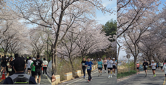 벚꽃도 절정이라 코스 전체가 꽃길처럼 이어져 있었고, 마지막에는 달리면서 자연스럽게 사진을 찍는 참가들도 많았습니다.